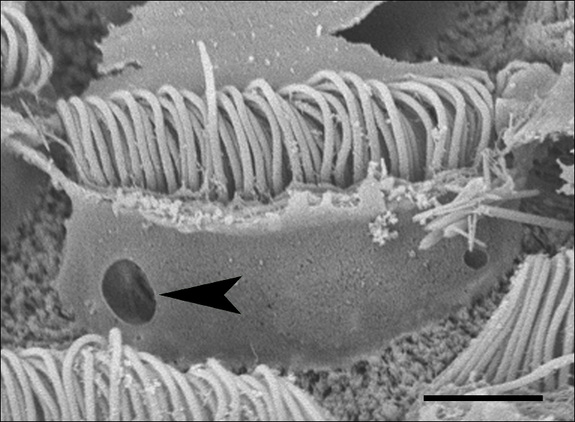 All the stranded squid had one common feature- which was damage to their statocysts. These organs are balloonlike sacs lined with sensitive hair cells which is used to maintain the animal’s balance/position in the water. Holes were found in all the stranded squid’s statocysts, raising the possibility that low-intensity sound can cause this type of damage. More research is already in the process pertaining to why this ocean noise can have this large of an effect on these creatures. I’ll keep you updated. Here is a picture of a damaged statocysts inside one of the research squid found off of Spain.